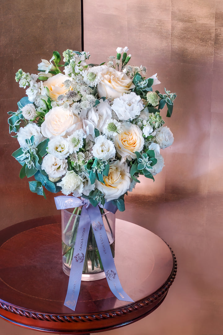 Velvety Ecuadorian Candlelight roses cradle the heart, while frosted hydrangea blooms like soft clouds. Delicate astrantia stars and scabiosa’s lace-like whispers mingle with the sweetness of stock flowers, each petal a hymn to timeless love. Misty grey-green foliage drapes the arrangement in subtle serenity, grounding its ethereal glow.
